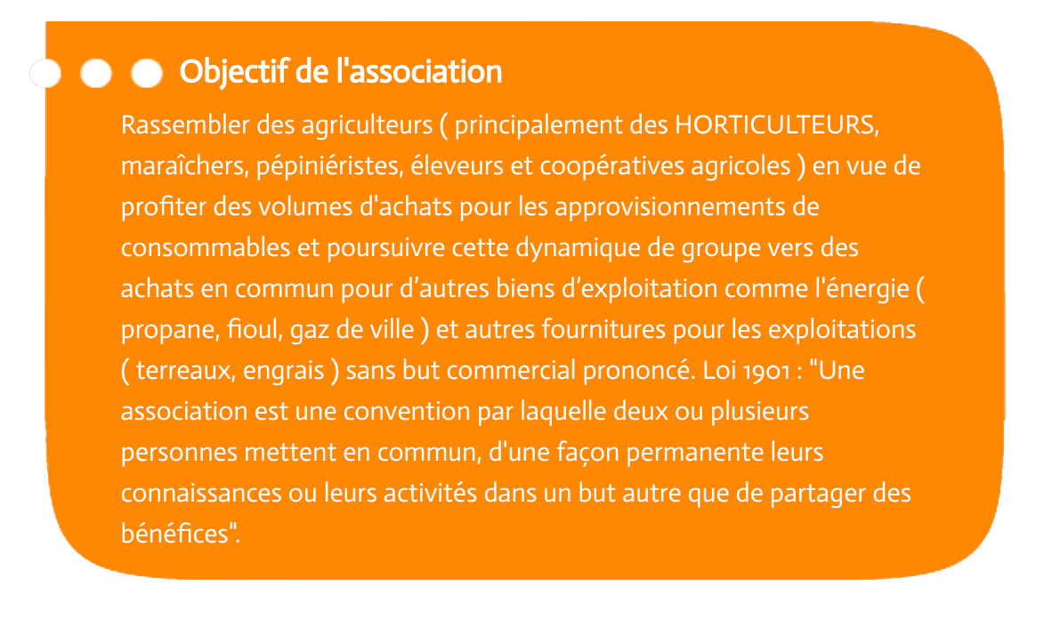 Rassembler des agriculteurs ( principalement des HORTICULTEURS, maraîchers, pépiniéristes, éleveurs et coopératives agricoles ) en vue de profiter des volumes d’achats pour les approvisionnements de consommables et poursuivre cette dynamique de groupe vers des achats en commun pour d’autres biens d’exploitation comme l’énergie ( propane, gaz de ville ) et autres fournitures pour les exploitations ( terreaux, engrais ) sans but commercial prononcé. Loi 1901 : « Une association est une convention par laquelle deux ou plusieurs personnes mettent en commun, d’une façon permanente leurs connaissances ou leurs activités dans un but autre que de partager des bénéfices ».