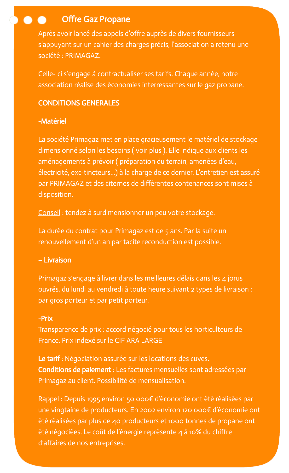 Celle- ci s’engage à contractualiser ses tarifs. Chaque année, notre association réalise des économies interressantes sur le gaz propane.